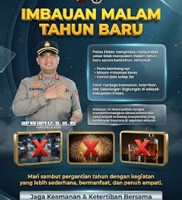 Polres Klaten mengimbau masyarakat agar menyambut malam pergantian Tahun Baru dengan cara yang sederhana, tertib, dan penuh empati demi menjaga keamanan serta ketenangan lingkungan di wilayah Kabupate...